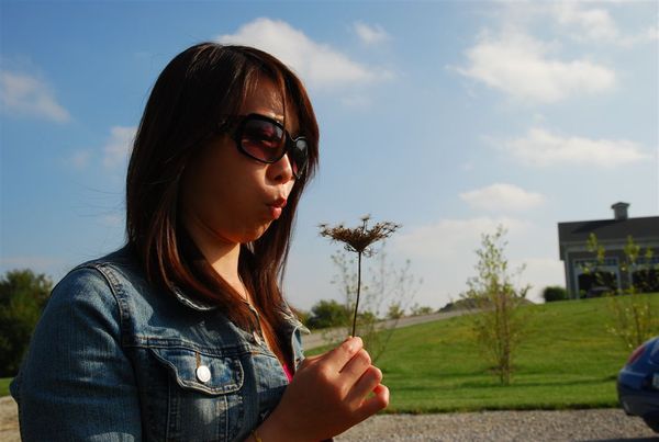 好笑又可愛的姐姐,以為手上拿的那株是蒲公英,在努力吹幾下發現沒有反應後,才意識到這個不是他心目中的蒲公英....^^"